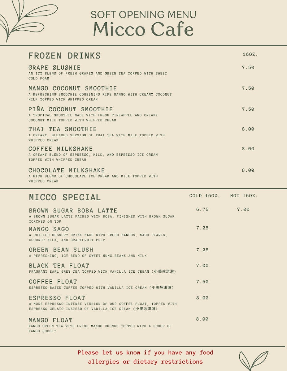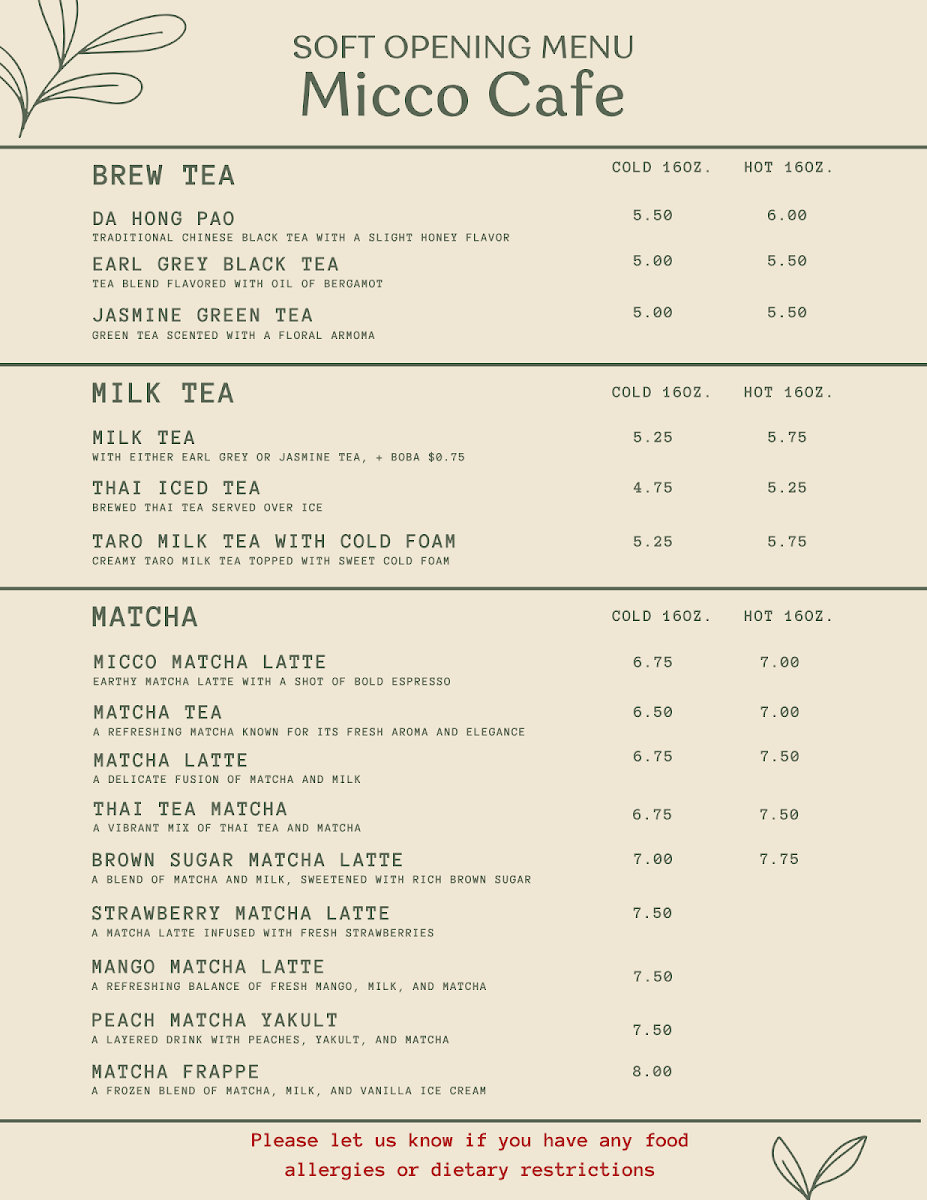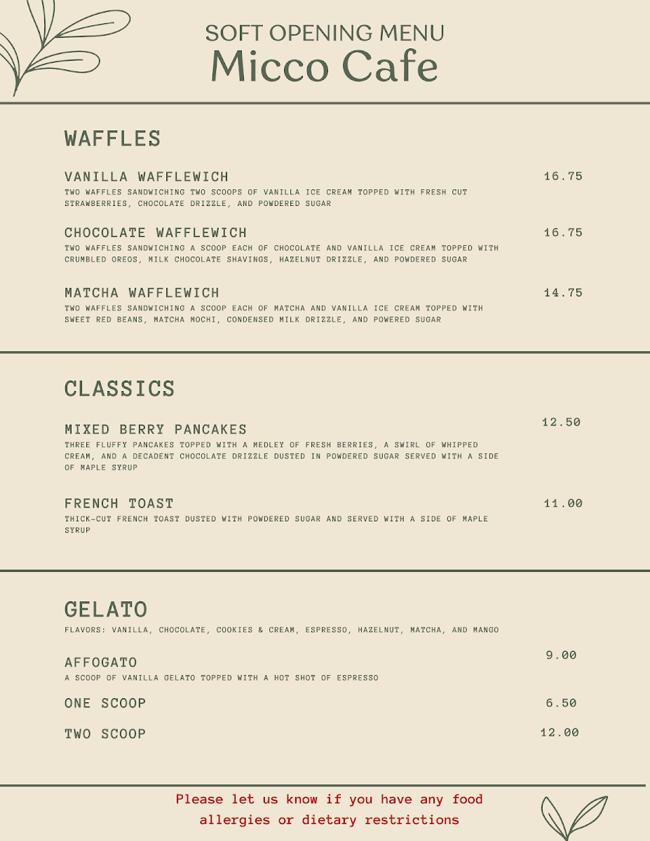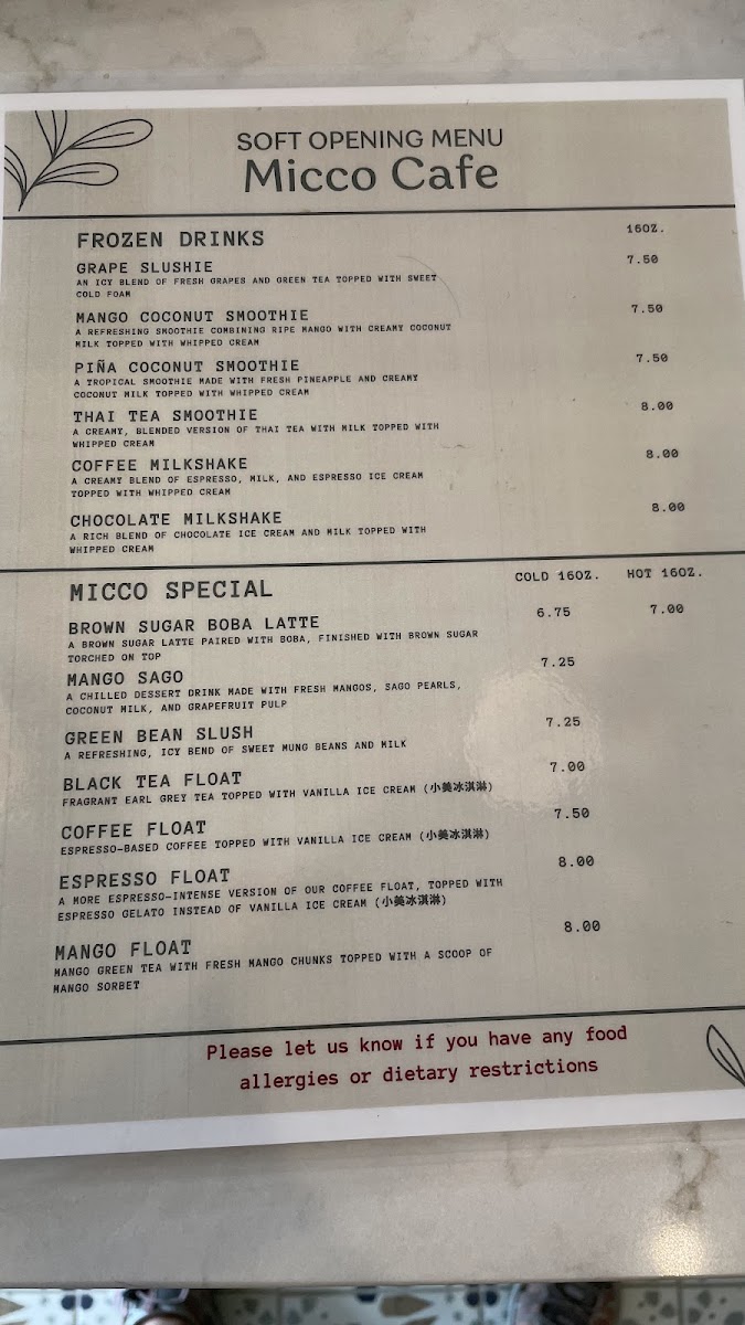 Reviewers like Isabella rave about the Matcha Waffles and praise the overall vibe, while Gabe Hung appreciates the consistency of the quality, though he suggests a little signage about timing for certain ingredients. Meanwhile, Ellie Lin highlights their genuinely friendly staff and generous portions, indicating that there's something undeniably special about the service at Micco Cafe. With clean facilities, ample seating, and a hint of modern charm, this is truly a gem in Bayside.