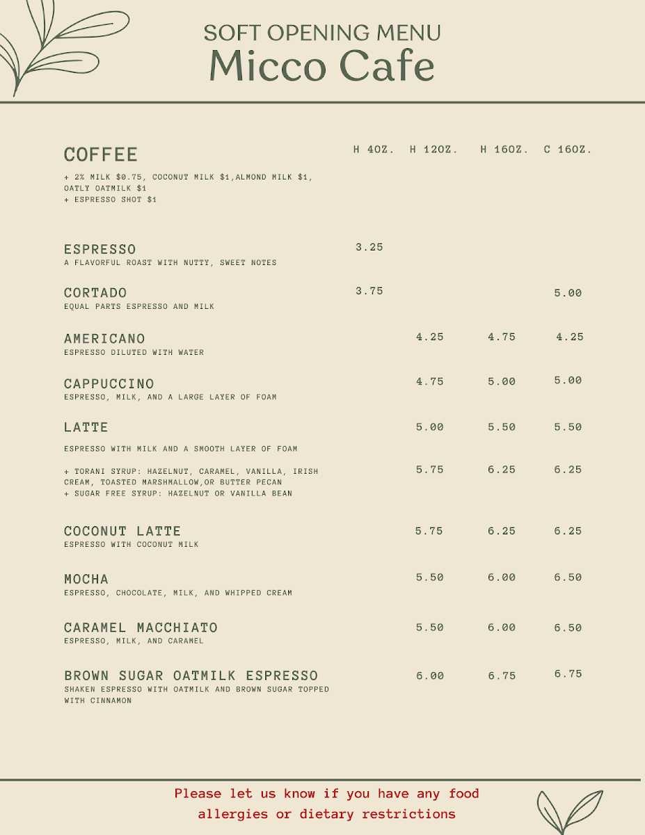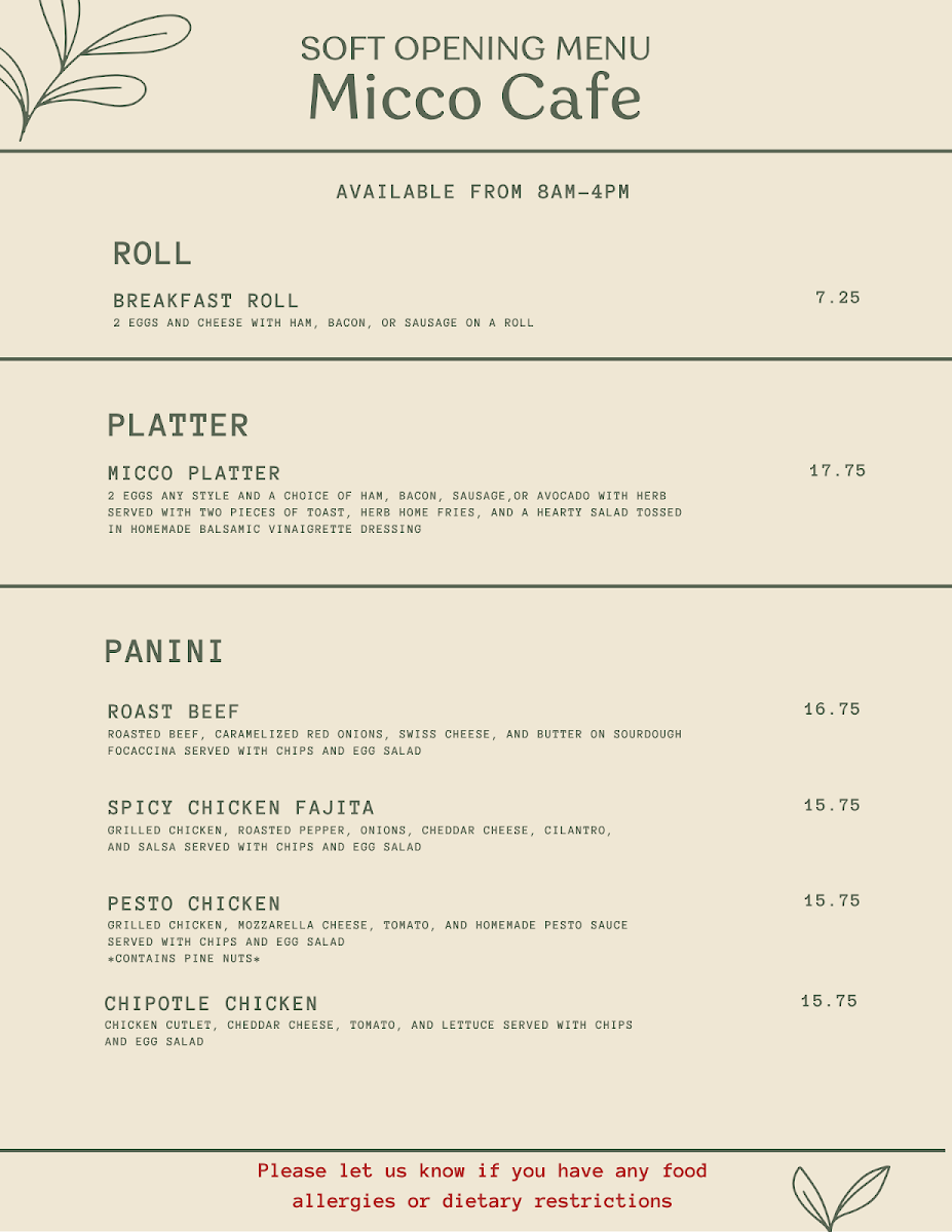 For those who appreciate a little savings, Micco Cafe rewards cash payments with a delightful 5% discount, adding extra value to your visit. So, why not plan a trip to Micco Cafe? Whether you're in the mood for a casual catch-up with friends or a productive day of studying, this lovely café is ready to welcome you with open arms and delicious offerings. Don't miss it!